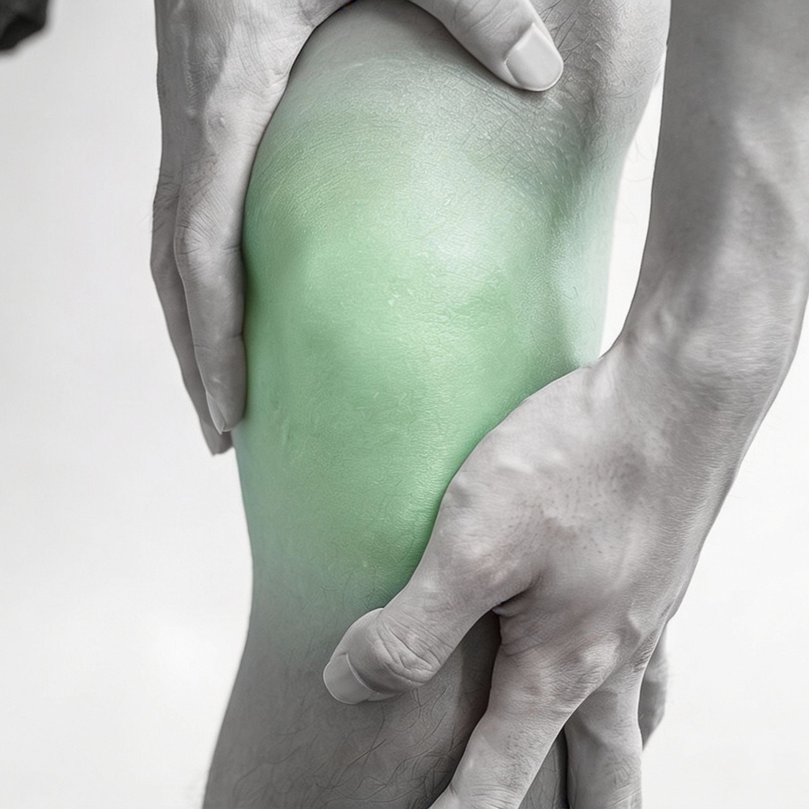 Desgaste da cartilagem, comum em jovens e atletas, com dor ao agachar ou subir escadas.